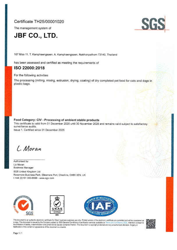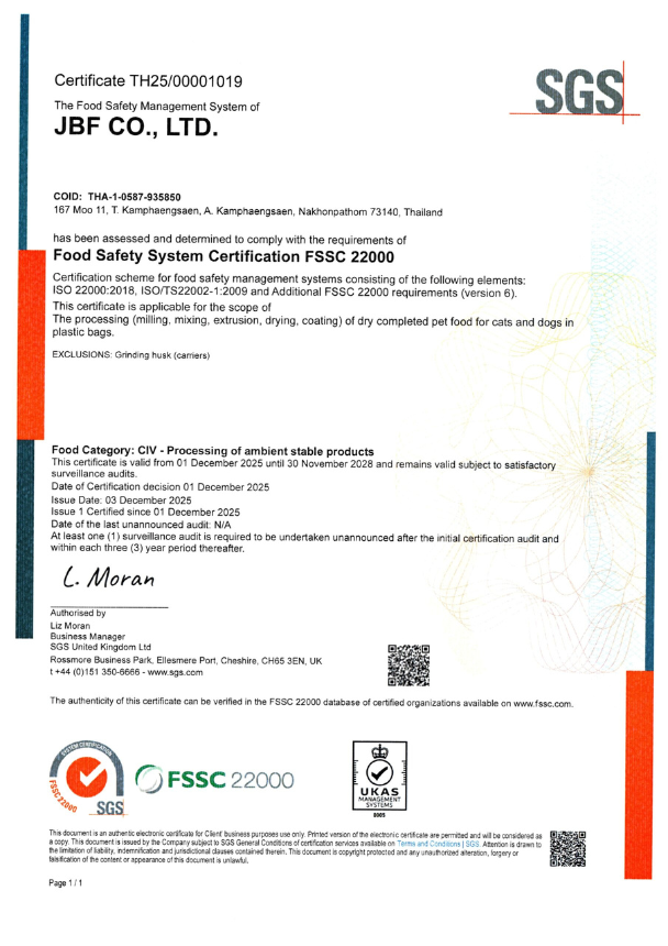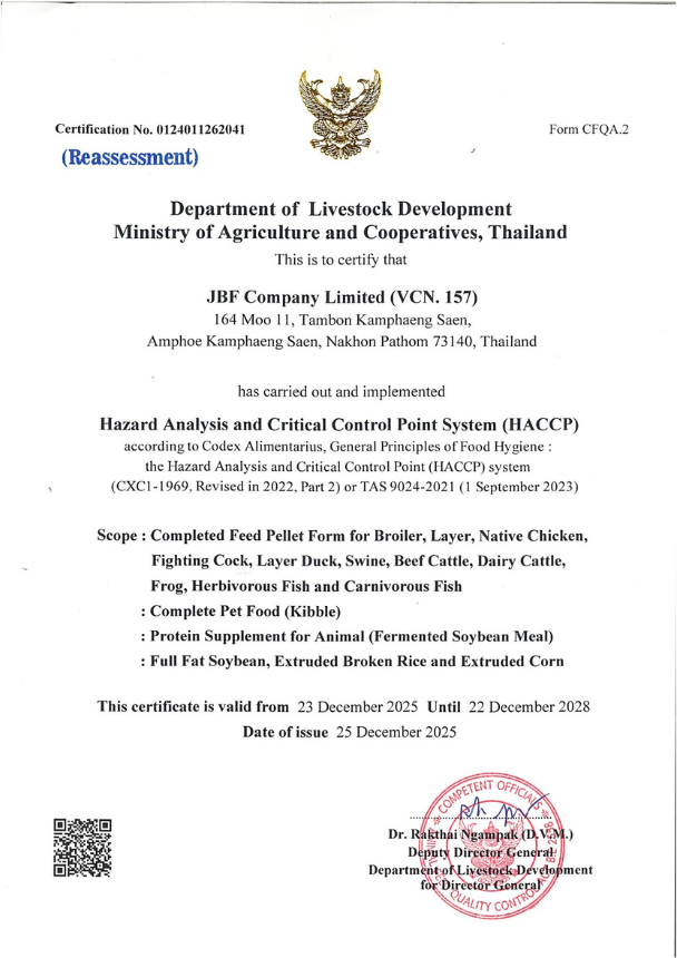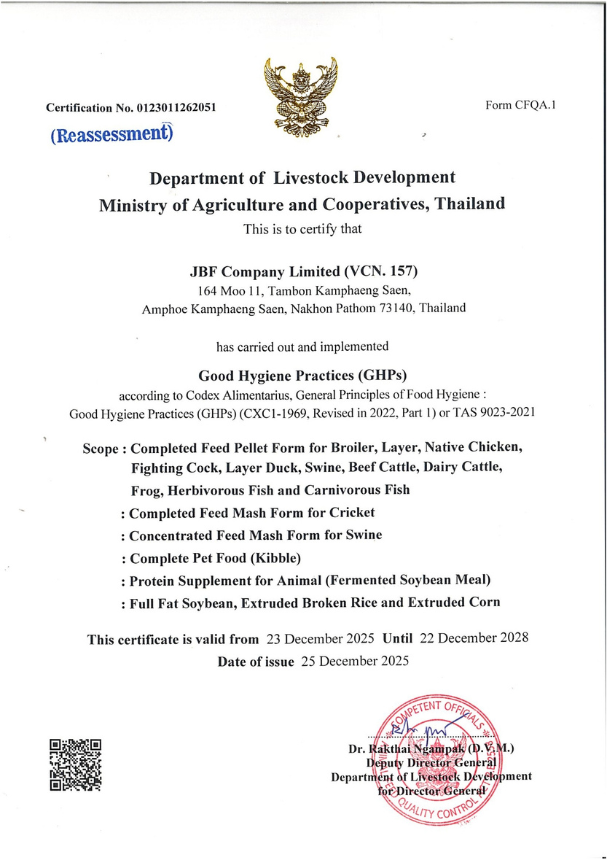 (2) โรงงานผลิตอาหารสัตว์ บริษัท เจบีเอฟ จำกัด – กระบวนการผลิตอาหารสัตว์และวัตถุดิบเติมเต็มโภชนาการสัตว์แบบครบวงจร ยกระดับอุตสาหกรรมด้วยระบบจัดการคุณภาพระดับสากล GHPs/HACCP, ISO9001:2015, ISO14001:2015 และเพิ่มความเชื่อมั่นด้วยห้องปฏิบัติการวิเคราะห์ที่ผ่านการรับรองมาตรฐาน ISOIEC 17025