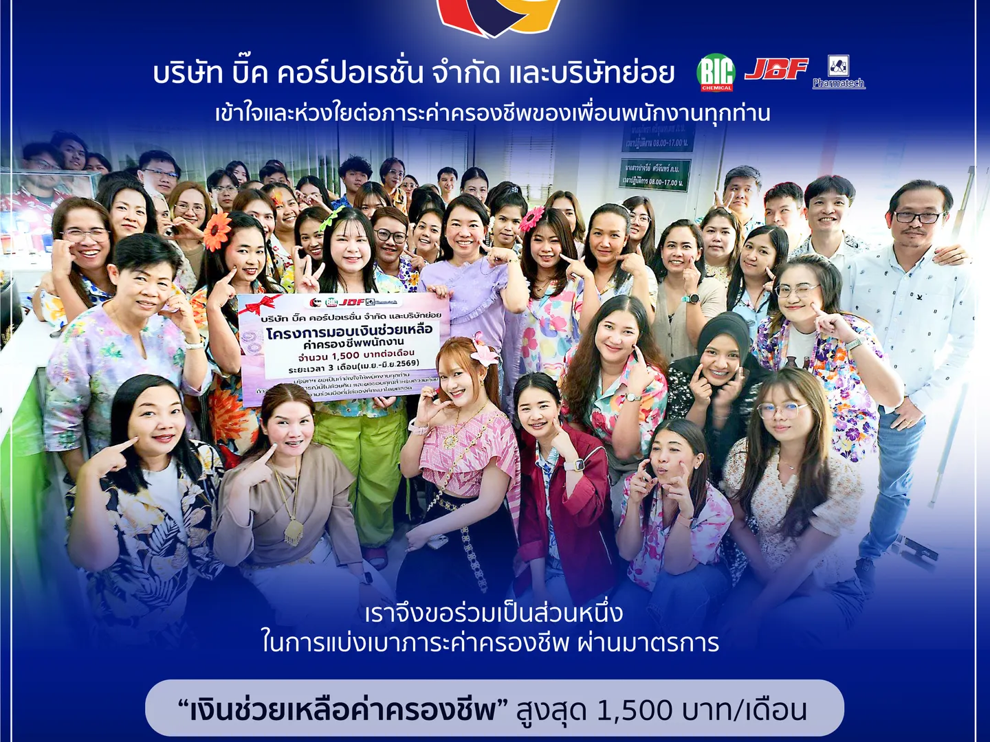 ด้วยความห่วงใยในสวัสดิภาพของพนักงานทุกท่าน ❤️ บริษัทฯ จึงขอร่วมเป็นส่วนหนึ่งในการแบ่งเบาภาระผ่านมาตรการ “เงินช่วยเหลือค่าครองชีพ” เพื่อสนับสนุนคุณภาพชีวิตและสร้างขวัญกำลังใจให้แก่พนักงาน